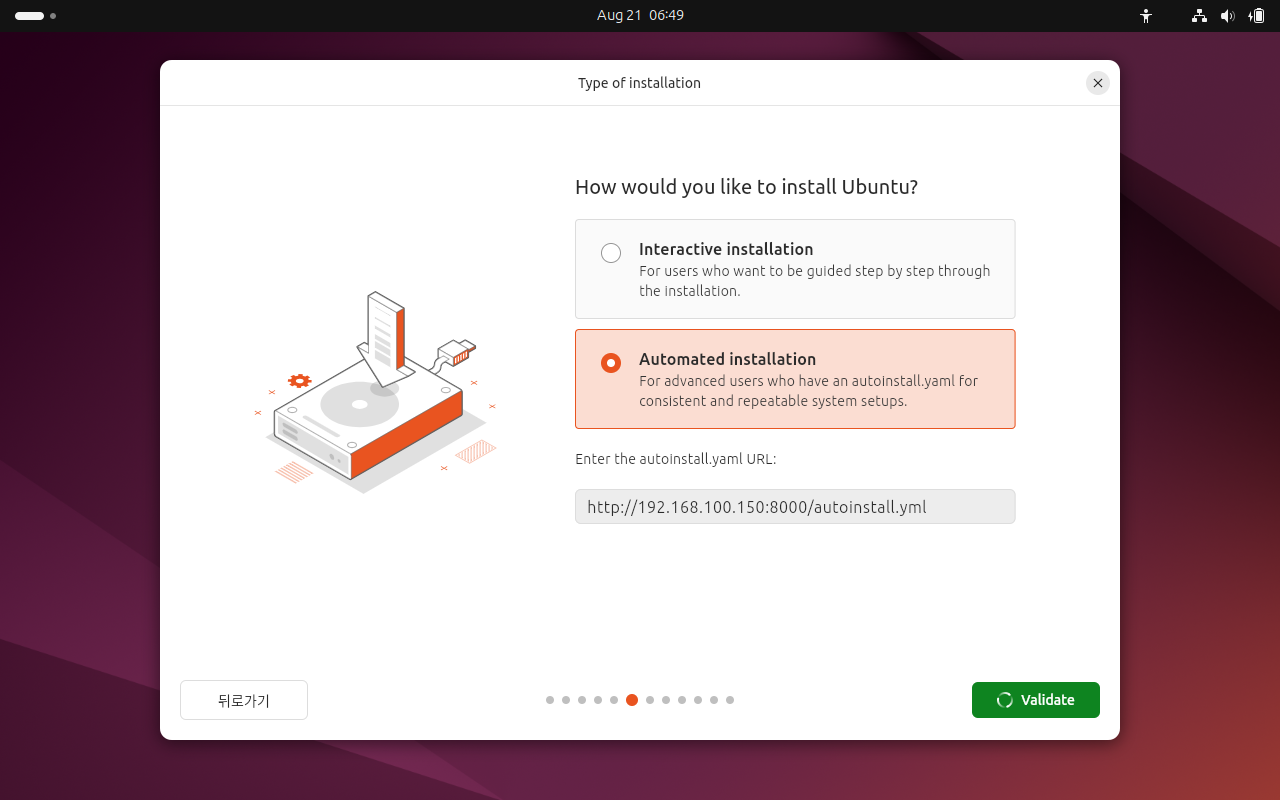 설치를 진행하고 아래 화면에서 다음과 같이 자동설치를 선택후 http://자신의 IP:8000/autoinstall.yml 를 입력합니다.