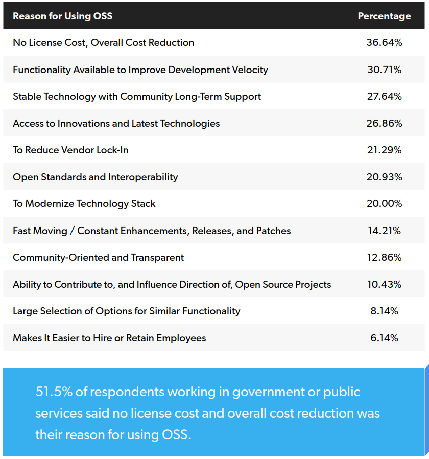 2. **오픈소스 채택 이유**: 비용 절감(특히 라이선스 비용 없음)이 오픈소스 소프트웨어 채택의 주요 이유로 나타났습니다. 이는 특히 정부나 공공 서비스 분야에서 강하게 나타났으며, 경제적 압박이 증가하면서 비용 절감이 더 중요해졌습니다.